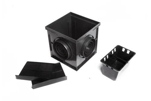 Комплект включает в себя дождеприемник размером 300x300 мм с двумя перегородками для защиты от неприятного запаха и корзиной для мусора.