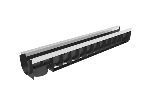 Лоток усилен по верхней продольной кромке металлическим пластинами с пазом, надежно удерживающим пластиковую/стальную/чугунную решетку. Лоток подсоединяется в системы водоотводов с помощью торцевого или углового перехода. Выпуск воды нижний.