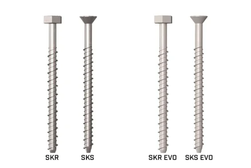 Анкер SKR прочен и прост в установке благодаря увеличенной геометрии шестигранной головки. SKR и SKS выпускаются в некоторых размерах со специальной обработкой поверхности для повышения коррозионной стойкости наружной головки. Из углеродистой стали с блестящим цинковым покрытием, доступны также версии из углеродистой стали с покрытием C4 EVO. Бетонные анкеры SKR и SKS идеально подходят для крепления деревянных или стальных элементов к бетонным опорам. Классы эксплуатации 1 и 2. Версии с покрытием C4 EVO допускают применение в 3 классе эксплуатации.