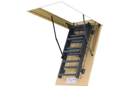 Лестница складная металлическая FAKRO LMS - базовая модель металлической складной лестницы. Утеплённая крышка люка бежевого цвета гармонично вписывается в потолок, обшитый древесиной. Представляет собой складную конструкцию из металлического лестничного марша и термоизоляционной крышки люка.