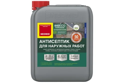 NEOMID 440 ECO – бесцветное средство для наружных и внутренних работ, в том числе для помещений с повышенной влажностью. Предназначено для защиты древесины различных пород от гниения, поражения дереворазрушающими и деревоокрашивающими плесневыми грибами, насекомыми-древоточцами, водорослями, мхами, лишайниками на срок до 25 лет (если закрыт пленкообразующим составом, например, лессирующим средством NEOMID BiOCOLOR).
