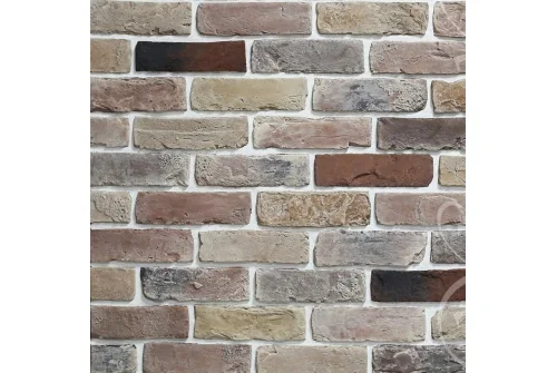 Фактура декоративного камня из новой коллекции выполнена под старину, края кирпичей имеют неоднородную форму, а на поверхности видны выщербленные детали и неровности.