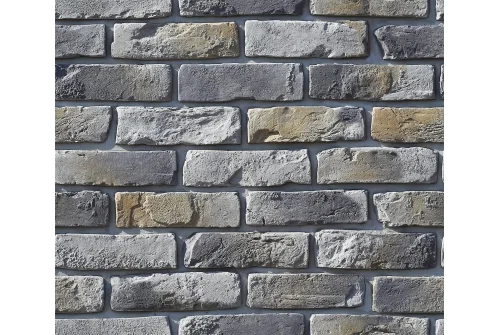 Фактура декоративного камня из новой коллекции выполнена под старину, края кирпичей имеют неоднородную форму, а на поверхности видны выщербленные детали и неровности.