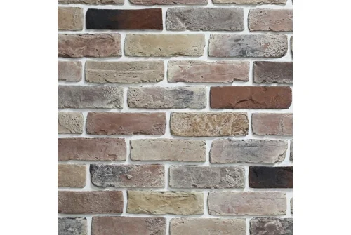 Фактура декоративного камня из новой коллекции выполнена под старину, края кирпичей имеют неоднородную форму, а на поверхности видны выщербленные детали и неровности.