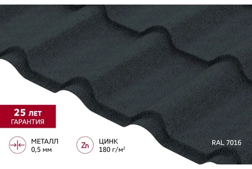 Металлочерепица "Камея" ("Kamea") v01 0,5 Satin Matt TX RAL 7016 антрацитово-серый