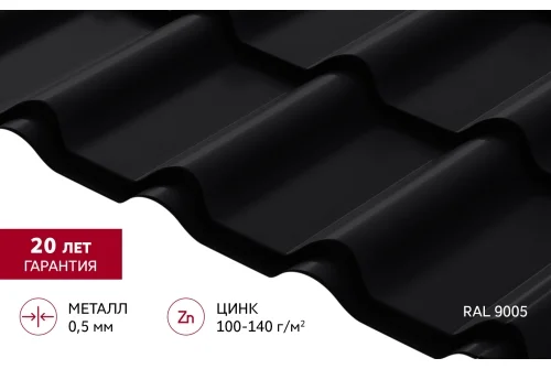 Металлочерепица "Камея" ("Kamea") v01 0,5 Satin RAL 9005 черный
