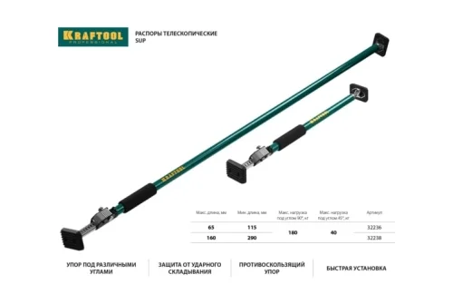 Телескопический распор KRAFTOOL SUP-3 160-290 см 32238 предназначен для поддержки и фиксации. Возможность упора под различными углами. Защита от складывания. Противоскользящий резиновый упор не повреждает поверхность. Быстрая и простая установка.