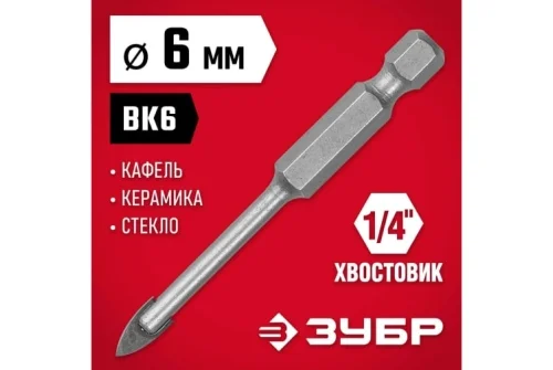 Сверло по стеклу и кафелю Зубр (d6мм), 2x кромка, Hex 1/4 (29840-06)