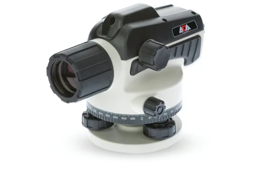 Устройство всех оптических нивелиров похожее. В конструкции имеется зрительная оптическая труба, в которой заключены объектив и увеличительные стекла с сеткой нитей. Во время работы для наведения труба вращается по горизонтали и посредством настраивания регулировочного винта оптика фокусируется на геодезической рейке. Ориентируясь на горизонтальную сетку нитей, оператор оптического нивелира снимает показания высот на рейке.
