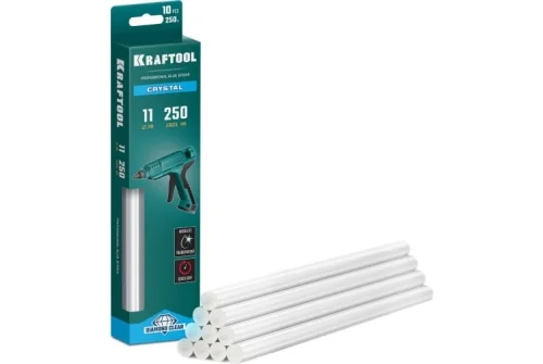 Прозрачные клеевые стержни KRAFTOOL Crystal 10 шт, 11x250 мм 06846-10 - универсальные клеевые стержни со специальным составом обеспечивающим полную прозрачность клея после застывания.