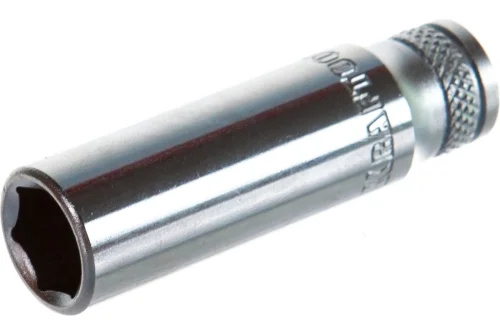 Удлиненная торцевая головка "INDUSTRIE QUALITAT" Kraftool 27817-10 изготовлена из хромованадиевай стали ( Cr-V) и покрыта хромосатинированным напылением, что обеспечивает защиту оснастки от коррозии.