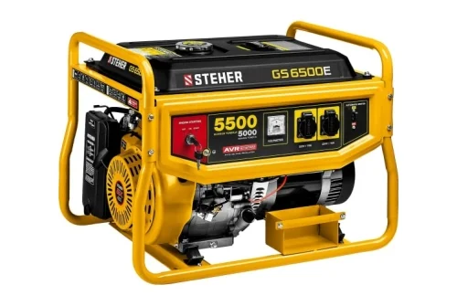 - Бензиновый генератор STEHER с электростартером GS-6500Е имеет систему поддержания параметров выходного напряжения (AVR), что обеспечивает стабильность характеристик для питания, в том числе наиболее требовательных потребителей.