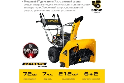 Бензиновый снегоуборщик STEHER Extrem 72 см GST-772E применяется для уборки снега на участках, придомовых территориях или расчистки пешеходных зон в общественных метах.