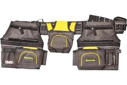 Пояс монтажника KRAFTOOL 38742, применяется для переноски разнообразного инструмента, необходимого при проведении ремонтно-монтажных работ.