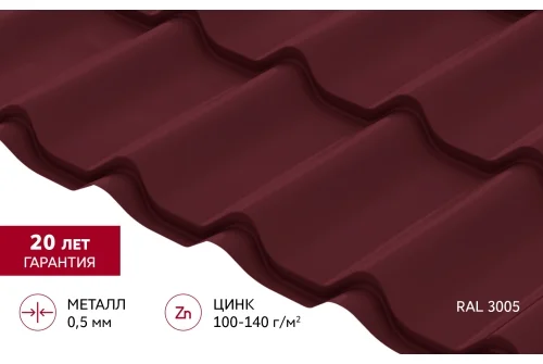 Металлочерепица Классик ("Classic") v01 0,5 Satin RAL 3005 красное вино