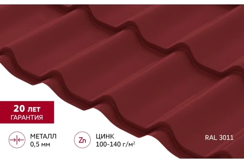 Металлочерепица Классик ("Classic") v01 0,5 Satin RAL 3011 коричнево-красный