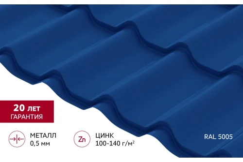 Металлочерепица Классик ("Classic") v01 0,5 Satin RAL 5005 сигнальный синий