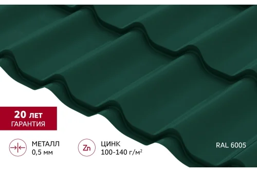 Металлочерепица Классик ("Classic") v01 0,5 Satin RAL 6005 зеленый мох