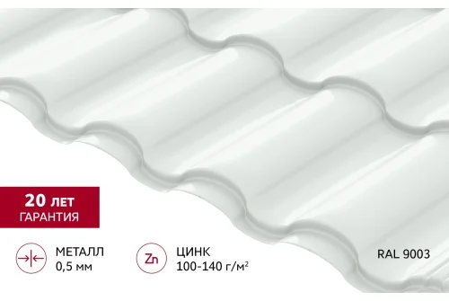 Металлочерепица "Кредо" ("Kredo") v01 0,5 Satin RAL 9003 сигнальный белый