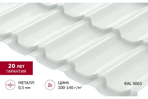 Металлочерепица "Квинта плюс" ("Kvinta plus") 0,5 Satin RAL 9003 сигнальный белый