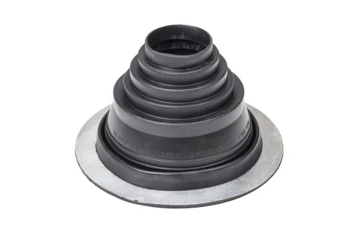 Гибкий уплотнитель из EPDM-резины с фланцем, имеющим алюминиевое покрытие, допускает тепловые и механические колебания, герметизируя отверстие в кровле.